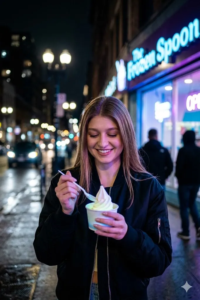 Create a night street photo in front of a glowing ice cream shop during evening time. Bright neon lights in blue and purple shine on your face and create a cinematic look. You are wearing a stylish black bomber jacket or a modern crop top outfit. The photo shows a natural smiling moment while you are looking at a glowing frozen yogurt cup in your hand. In the background the street lights appear as soft circles of light which makes the scene look beautiful. Your face shape eyes and natural features remain the same as the original photo.