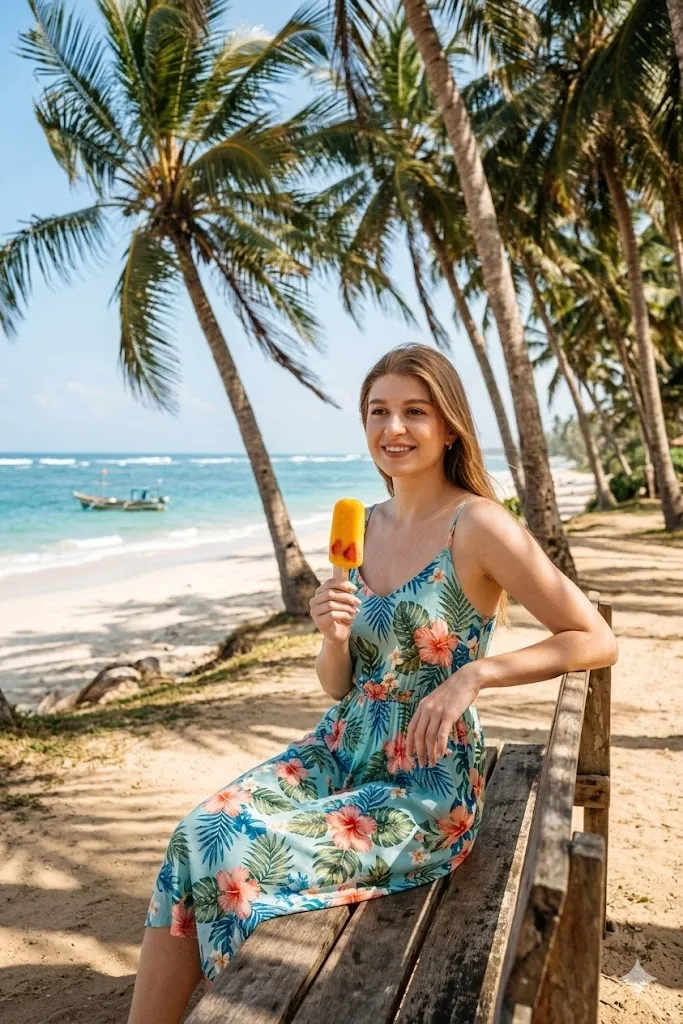This photo scene moves you into a tropical vacation setting. You are sitting on a wooden bench under tall palm trees moving slowly in the wind. Your outfit includes a Hawaiian floral shirt or a light cotton summer dress. In your hand you are holding a fruit flavored ice pop that shines in the sunlight. In the background there is a blue ocean and white sand beach view. Your natural skin tone and facial details stay exactly the same as your original photo while the scene looks like a travel blogger photo.