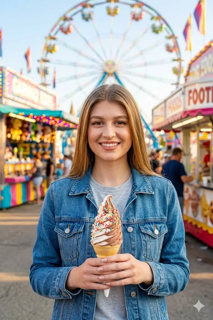 This scene places you in a colorful summer fair. Behind you there is a large ferris wheel that appears slightly blur in the distance. You are wearing a casual denim jacket over a simple t shirt. In your hand you are holding a large swirl soft serve ice cream topped with colorful sprinkles. The environment feels bright fun and energetic like a real summer carnival. Your real smile and eye expression remain exactly the same while your outfit and background look like a professional photo.