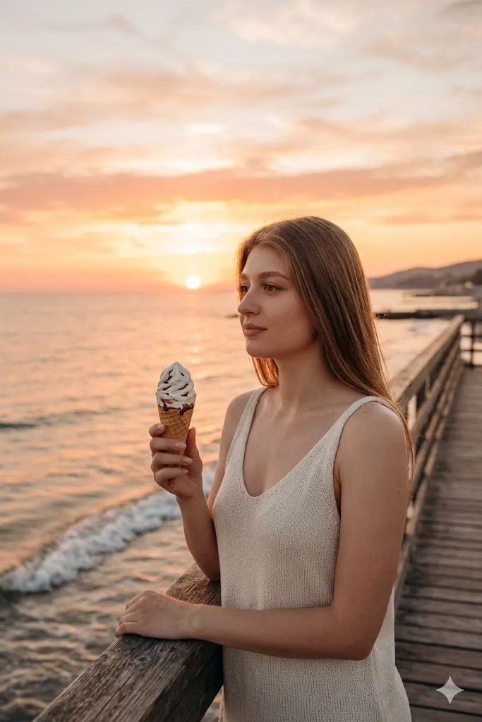 Create a peaceful sunset photo on a wooden sea pier. The sky shows beautiful orange pink and golden sunset colors. You are wearing relaxed summer clothes such as a tank top or light knit sweater. In your hand you are holding a melting ice cream cone while looking toward the ocean view. The warm sunset light highlights your natural facial features perfectly. Your body shape and face remain the same as the uploaded photo which makes the image look real and emotional.