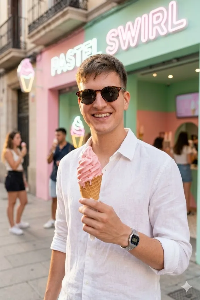 Create a stylish summer street photo in front of a popular soft serve ice cream shop. The wall behind you has soft pastel pink and mint green colors that look bright and trendy. You are wearing a clean white linen shirt with stylish sunglasses that give a relaxed summer look. Your face stays exactly the same as your original photo. In your hand you are holding a large waffle cone filled with melting strawberry ice cream. The light is warm sunset light that makes the skin look soft and glowing. The background is slightly blur so the main focus stays on your face and the ice cream cone.