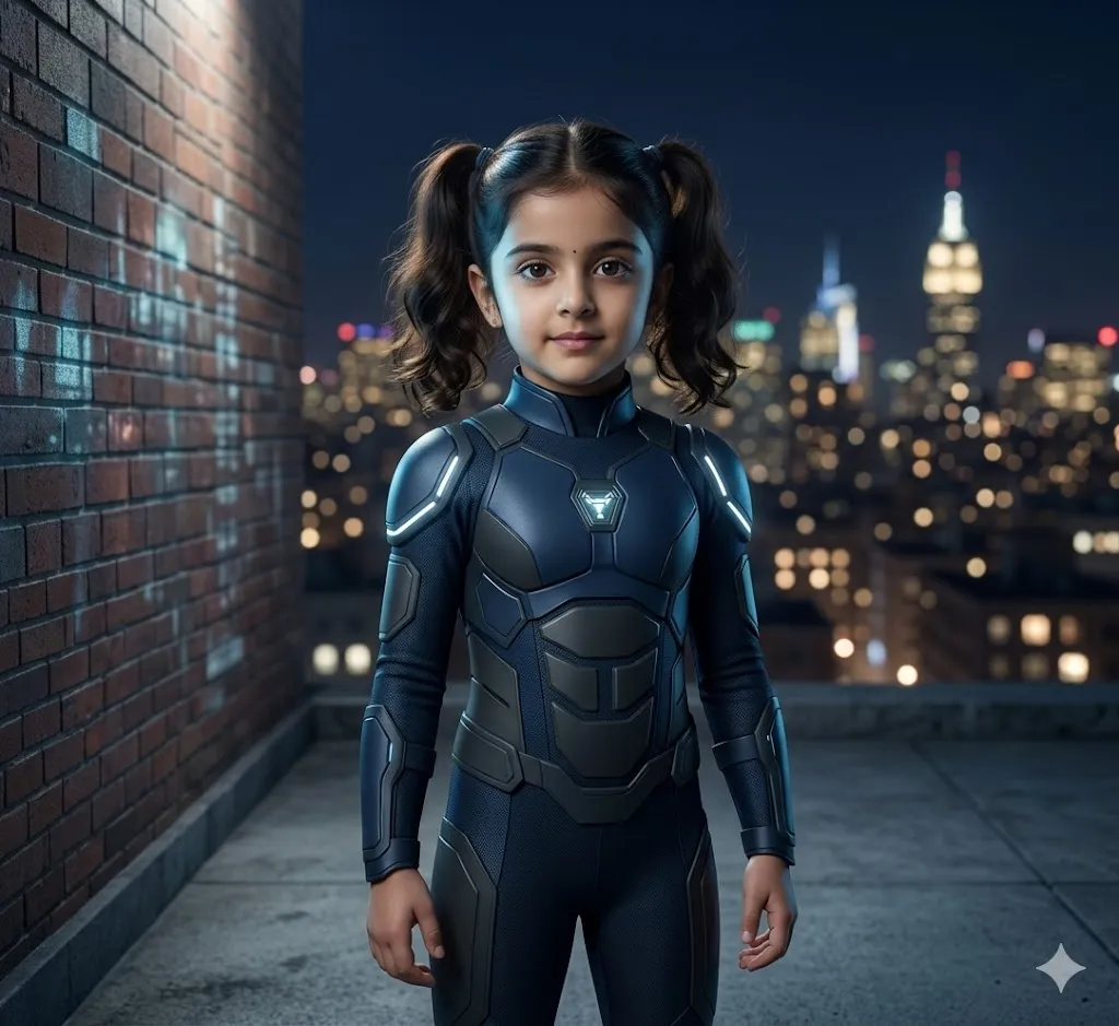 AI superhero photo prompts are simple text instructions that help tools like Gemini AI, ChatGPT image editors, and nano banana AI turn a normal kid photo into a real looking superhero scene. You just upload a clear photo, paste the prompt, and the AI edits the image while keeping the same face. It adds pose, background, costume, and power effects in a natural way so the final image looks like a cinematic real photo, not a cartoon.