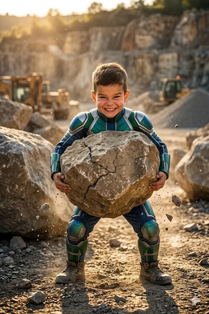 Edit my photo and show my child lifting a big rock. Keep face same with strong expression. Add rocky area or work site in background. Add a strong superhero suit with thick design. Show cracks on the rock and dust around. Do not add glowing power, keep it natural strength. Use dramatic light. Make full realistic scene in 8k.