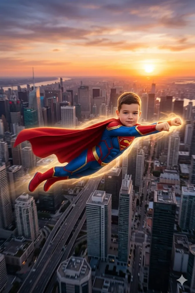 Edit my photo into a flying superhero scene. Keep my child face same as original photo. Make the pose like flying in air, body straight, face looking forward with strong and focused expression. Add a big city in background at sunset with tall buildings. Add a custom superhero suit with bright colors and a long cape moving in air. Add a soft glow around body and hands to show power. Add slight motion blur for speed feel. Keep lighting cinematic and natural. Make it ultra realistic, high detail, 8k quality.