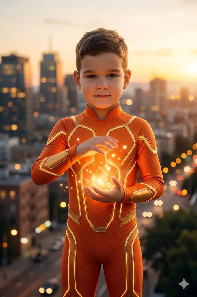 Edit my photo into a safe superhero fire power scene. Keep my child face same as original photo with a confident and calm look. Make the pose like hands gently creating glowing warm light. Add a soft evening city background with warm light around. Add a bright orange superhero suit with light glow design. Show controlled glowing energy in hands like warm light effect, not real fire. Add soft light particles around hands. Keep the scene safe, calm and positive. Use natural cinematic lighting and high detail. Make it ultra realistic, 8k quality.