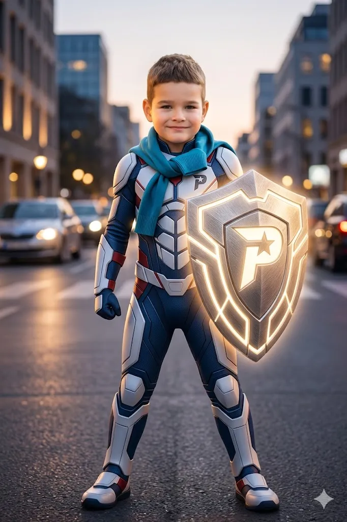 Edit my photo into a superhero protector scene. Keep my child face same as original photo. Make pose confident and strong while holding a large shield. Add a clean city background in evening with soft lights. Add a stylish superhero suit with light armor design. Add a gentle glow on the shield to show protection. Keep the mood positive, safe and inspiring. Use soft cinematic lighting and ultra realistic details in high quality.