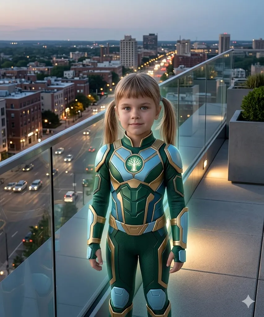 Edit my photo and place my child in a safe rooftop setting with proper railing or glass protection. Keep face exactly same as original photo. Make pose confident, standing calmly and looking at the city. Add a wide city view in evening with lights turning on. Add a stylish superhero suit with a clear logo on chest. Add a soft light glow from the suit. Make sure the environment looks safe and secure for a child. Keep mood brave and calm. Use soft cinematic lighting and high detail textures. Make it look like a real photo in 8k quality.