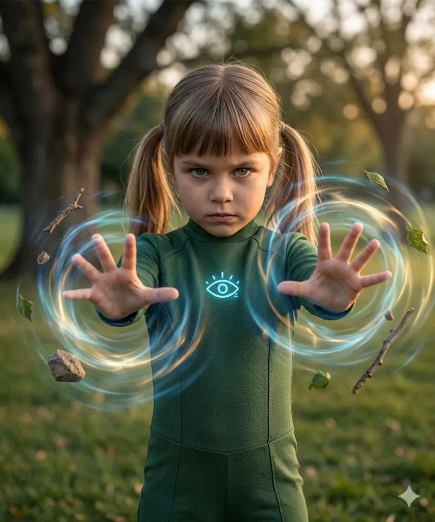 Edit my photo and show me using mind power. Keep face same with focused look. Make both hands forward. Add park or open place in background. Show objects floating in air around. Add soft glowing energy around hands and objects. Add a simple superhero suit with a small glowing symbol. Add light air distortion effect. Keep scene realistic and cinematic with high detail.