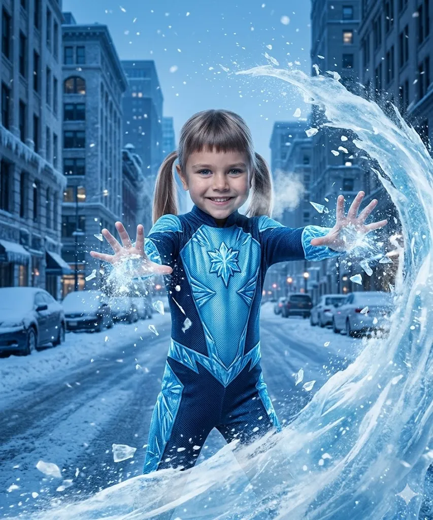 Edit my photo into an ice power scene. Keep face same and focused. Make hands forward creating ice wave. Add snowy street or cold city background. Add blue superhero suit with ice design. Add snow particles and ice effect coming from hands. Add cold breath effect. Keep lighting cool and cinematic. Make it look real, high detail 8k.
