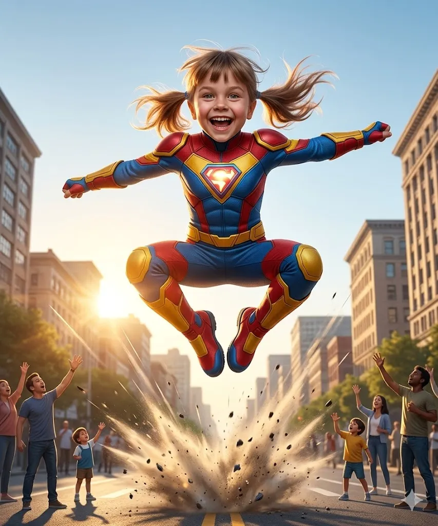 Edit my photo and show my child jumping high in air. Keep face same with happy or excited look. Add city background in morning. Show people below looking up. Add colorful superhero suit. Add motion lines and dust effect from jump. Keep pose wide and active. Use cinematic lighting and realistic detail in 8k.